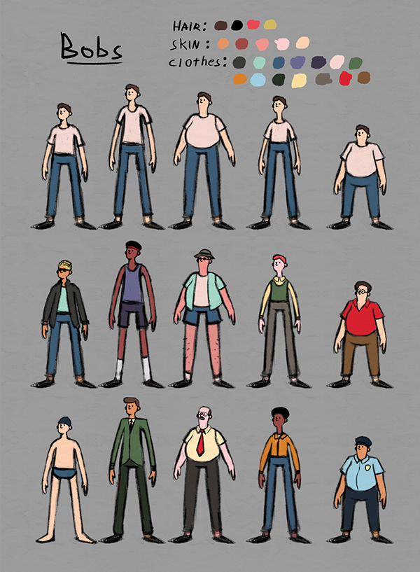 “Bobs” e “Pigeons” foram as primeiras vinhetas que começamos a trabalhar. Elas serviram como uma guia para as demais. Estávamos tentando buscar um estilo entre o realismo e a abstração e começamos a botar algumas ideias no papel. O objetivo era pensar em um estilo que fosse simples o suficiente para replicar, já que para a vinheta “Bobs”, especificamente, precisaríamos de centenas de personagens diferentes.